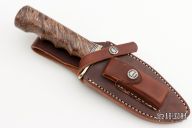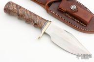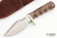 This Model 19-5 by Randall Made Knives features a satin finish clip point blade with sharpened top edge and notched thumbrest, .226" blade stock and 1.767" blade stock, hidden tang construction. The handle has a nickel silver guard, finger groove burl wood grip with black/duralumin spacers. Includes a brown leather sheath and a Randall zippered case. Excellent condition.