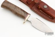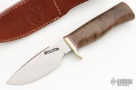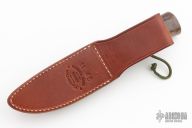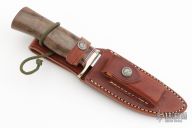 The Model 11 is the original drop-point blade. Designed by Tommy Thompson, noted Alaskan guide, in 1952 for big-game skinning, with point dropped below top of blade to prevent cutting too deeply through skins when used point first. This knife has a satin finished blade with notched thumbrest, .211" blade stock and 1.374" blade depth, hidden tang construction. The handle has a nickel silver guard, walnut grip, and red/white/blue spacers. Comes with a brown leather sheath and a zippered case. Excellent condition.