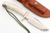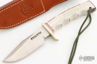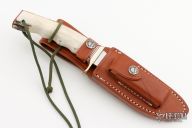 This Model 23 "Gamemaster" by Randall Made Knives features a satin finished clip point blade with sharpened top edge and notched thumbrest, .213" blade stock and 1.283" blade depth hidden tang construction. The handle has a nickel silver guard and butt plate, finger groove slab side stag grip with red/duralumin spacers. Comes with a brown leather sheath and a Randall zippered case. Excellent condition.