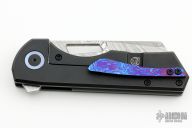 This Production Yeager by Brian Brown features a wharncliffe style Damasteel blade. The handle has a black PVD titanium frame with titanium pivot collars, tip up clip and backspacer. Comes with original box, COA and zippered case. Timascus clip. Excellent condition.
