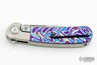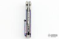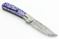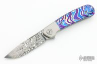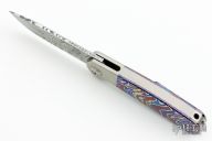This L1 is a Liong Mah design executed by Reate Knives. It features a Damasteel blade with notched thumbrest, fullers and flipper. The handle has a blasted integral ti bolsters, Mokuti inlays with a matching tip up clip. Comes with original zippered case and card. Excellent condition.