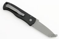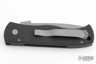 This Emerson/Pro-Tech CQC7 automatic has a chisel ground bead blast finish blade with a plain edge and a solid black aluminum handle. Bead blast stainless steel clip. Coil spring. New from Maker!