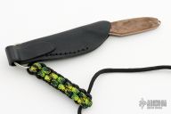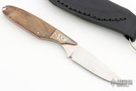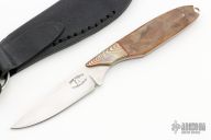 This knife by Jeff Cover features a hand rub satin finished blade with .095" blade stock and .664" blade depth, full tang construction. The handle has dovetailed mokume bolsters, mammoth ivory scales with red liners and nickel silver pins. Comes with a kydex sheath. Has a couple light scratches, otherwise excellent condition.