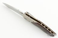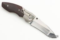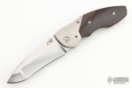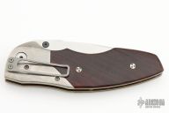 This custom Scout linerlock by Allen Elishewitz features a tumbled blade with a single thumbstud. The handle has orange peel finished titanium bolsters, cocobolo scales, textured and anodized titanium liners, barrel spacers, and a tip down bead blasted stainless steel clip. Gold Elishewitz logo medallion. Nice blade seating, detent, and lockup. Has some scratches on the clip, otherwise excellent condition.