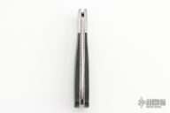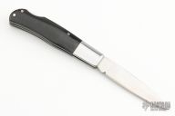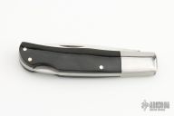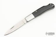 This lockback by "L" (please let us know if you know who this is) features a satin finished blade with nail nick. The handle has stainless steel bolsters and liners, black paper micarta scales, stainless steel backspacer. Has a couple light scratches, otherwise excellent condition.
