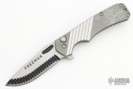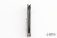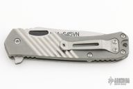 This knife by Freeman Outdoor Gear features a two-tone milled S45VN blade with notched thumbrest and flipper. The handle has a milled and blasted titanium frame with matching tip up clip. Rides on bearings, nice detent, lockup and blade seating. Comes with original box and papers. Has scuffs and scratches, great condition otherwise.