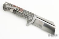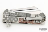 This ADV War-Hulk framelock flipper has a satin finished blade with fullers, notched thumbrest and flipper. Handle has a laser engraved frame, titanium backspacer with plastic inlays and tip up clip. Nice smooth action, detent, lockup and blade seating. Comes with zippered case. Excellent condition.