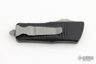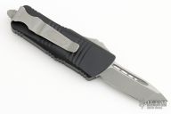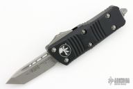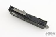 This Troodon Mini OTF automatic by Microtech knives features an Apocalyptic finished tanto blade, and a black aluminum handle with Apocalyptic hardware, tip down carry. Glass breaker. S/N 625. Dated 12/2020. Comes with original box and papers. Has some light scuffs and scratches. Excellent condition otherwise.
