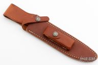 A. Model A– Supplied with Models 1, 2, 3, 4-5″ and longer, 5- 5″ and longer, 11, 12-6″, 16-7″ SP#1, 19, 20, 22, 23, 25-6″ and 27. With hone in the pocket. Sheath supplied with Models 12 and 13 similar, but larger, with hone in pocket. (Please Note: On 4 1/2″ and 5″ sheaths, the keeper strap snaps around the handle because there isn’t enough room above the hone pocket for a diagonal strap.)