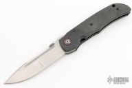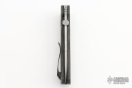 This Eagle Rock linerlock is from Custom Knife Factory and designed by Bob Terzuola. It features a bead blast finish multi-ground blade with fullers and false top edge, notched thumbrest and a thumbdisc. The handle has Timascus pivot collars, black bolsters, carbon fiber scales, black titanium liners, black backspacer, tip up black titanium clip. Nice blade seating, detent, and lockup. Excellent work. Comes with a zippered case and COA. Excellent condition.
