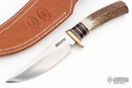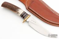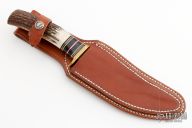 The Model 27 is an ideal all-around heavy-duty sportsman's knife. This knife has a carbon steel blade, .203" blade stock and 1.398" blade depth, hidden tang construction. The handle has a brass guard, and stag grip with black, brass, red, white, black micarta, and duralumin spacers. Randall Knife Society medallion in pommel. Marked RKS 581/1250 on "B" side of blade. Includes original brown leather sheath. Has a small oxidation spot on the blade, otherwise excellent condition.