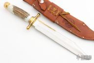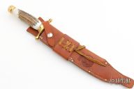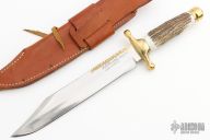 This bowie by Rudy Ruana features a satin finished bowie blade with a sharpened top edge and a brass back with hammer finish, .252" blade stock and 1.465" blade depth, hidden tang construction. The handle has a brass guard and butt, stag grip. Comes with a brown leather sheath. Excellent condition.