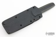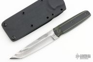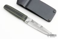This Aikuchi by Bud Nealy features a Meier Steel San Mai Damascus tanto blade with notched thumb and finger rests, .120" blade stock and 1.013" blade depth. The handle is comprised of black/green G-10 scales over full tang construction. Includes original MCS Sheath system with jacket pocket flap. Excellent condition.