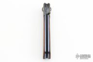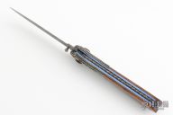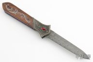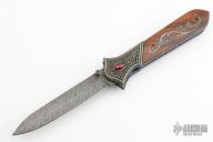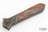 This Knife by Zaza Revishvili is a linerlock folder with a Damascus blade with false top edge, single thumbstud with ruby inlay. The handle has silver filegree bolsters with oval ruby inlays, walnut scales with silver wire inlays, anodized titanium liners with jeweled interiors, fileworked Damascus backspacer. Excellent condition. Comes with a zippered case.