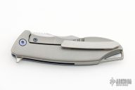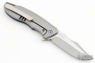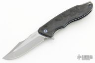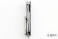 This S7 flipper by Michael Zieba features a two-tone blade with a notched thumbrest and a flipper. The handle has a marble carbon fiber and anodized titanium frame, black backspacer and an anodized titanium tip up clip with hidden screws. Nice detent, lockup and blade seating. Rides on bearings. Comes with hard case. Excellent condition.