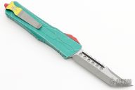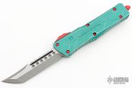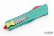 This Combat Troodon Bounty Hunter by Microtech Knives features a Hellhound tanto blade with fullers, satin flats and apocalyptic finished grinds. The handle has a green battle worn aluminum handle with red hardware, tip down apocalyptic finished stainless steel clip.  Includes the original box and papers.  Excellent condition. Dated 02/2023 s/n 3018.