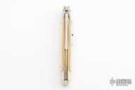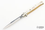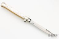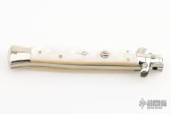 This swivel bolster auto by Latama features a bayonet blade with a false top edge. Nickle silver guard and rear bolster and mother of pearl scales. Nice function, strong firing and lock up. Excellent condition.