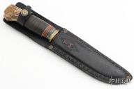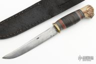 This hunter by William Scagel we believe was made around 1915 era. It has a carbon steel blade with his stamp, .182" blade stock and .965" blade depth, hidden tang construction. The handle has a reduced brass guard, crotch stag butt with brass pin, and a spacer pattern consisting of leather/aluminum/brass/red. Comes with original black leather sheath and a zippered case. Has some scratches and patina, there are some small gaps in the leather spacers, otherwise good condition for a 100+ year old knife! Pre-1910