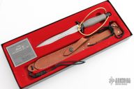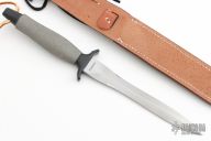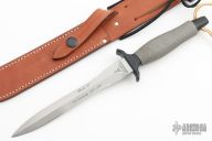 This 20th Anniversary Mark II #XX4952 has a satin finished stainless steel double-edged blade with hidden tang. Blade stock is .238", depth is .932". Handle is Grey "Cat's Tongue" textured aluminum with black double guard and black butt cap - with lanyard hole. Comes with original brown leather sheath, box, papers. This model has a 5 degree canter on the blade so it rides closer to the body during carry. Excellent condition.