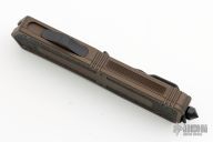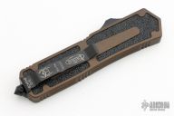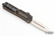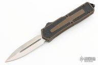This Scarab OTF automatic by Microtech knives has a satin finished double edge blade. The handle has a brown aluminum frame with non-slip inlays. Stainless steel clip. Glass breaker.  This tactical version has all black hardware.  Excellent condition. Dated 03/06.  Includes a nylon sheath.
