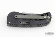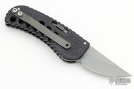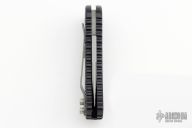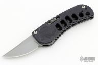 This Mini Rung Sat Lite by Rob Dalton has a bead blasted upswept blade with a skeletonized black aluminum frame, reversible tip up titanium clip. Action is strong. Has a couple light scuffs on the clip, otherwise excellent condition.