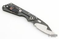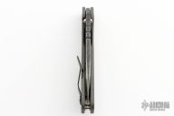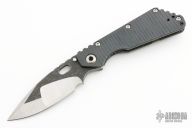 This Mick Strider custom SMF framelock folder has a two-tone nightmare ground blade with notched thumbrest and thumbhole. The handle has a flamed titanium frame with laser engraved titanium clip. Includes Lock Bar Stabilizer for maximum reverse lock retention. Nice lockup, blade seating and detent. Has a couple light scuffs, otherwise excellent condition.