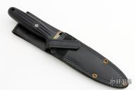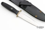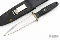 This Applegate Fairbairn Fighting Knife was made by TJ Yancey. It has a hand rub satin finished double edged blade (circa 1980) with hidden tang. 3/16" blade stock, 1-1/8" depth. Handle is black non-slip polymer with lanyard hole, and brass double guard (stamped "285"). For a 30 year-old piece, this knife is in excellent shape. Comes with custom black leather sheath by Tex Shoemaker & Sons. Only 331 made with the black polymer handle. Excellent condition.