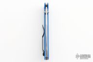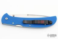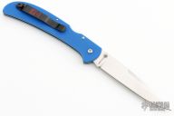 This Eagle Heavy Duty lock back by Al Mar Knives has a satin finished San Mai blade with dual thumb studs. Blue G-10 scales and a black stainless steel pocket clip, left or right reversible. Strong lock up. Excellent condition. Comes with original box. This knife was a limited edition and a Cutlery Shoppe Exclusive.