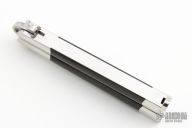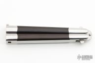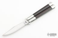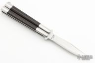 This early balisong from Pacific Cutlery features a Jody Samson ground satin finished blade with swedge. The handles are stainless steel with dovetail black linen micarta inlays, has t-latch. Has some light scratches, has been resharpened, otherwise good condition.