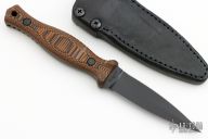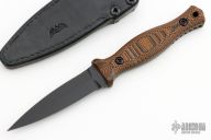 This Galvo Dagger by Les George features an Black ceracoated double-edged blade with .170" blade stock and .894" blade depth, full tang construction. The handle has black/orange Groovy G-10 scales and a lanyard hole. Comes with a black leather sheath by Chatanooga Leatherworks. Excellent Condition.