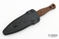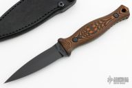 This Galvo Dagger by Les George features an Black ceracoated double-edged blade with .170" blade stock and .894" blade depth, full tang construction. The handle has black/orange fuller milled G-10 scales and a lanyard hole. Comes with a black leather sheath by Chatanooga Leatherworks. Excellent Condition.