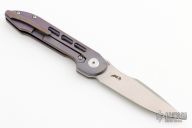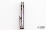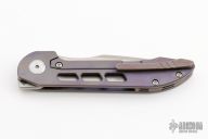 This Hound, from Boos Blades, features a tumbled blade with a hidden flipper tab. The handle an anodized titanium frame with a matching tip up clip over a titanium backspacer. Excellent Condition.