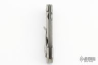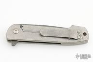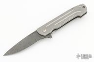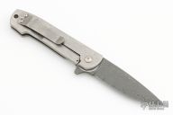 This Kumu by Defiant 7 features a Damascus blade with flipper. The handle has a stonewashed titanium frame with matching backspacer and tip up clip. Rides on bearings, nice detent, lockup and blade seating. Comes with a zippered case. Excellent condition.