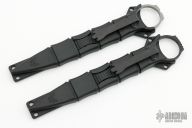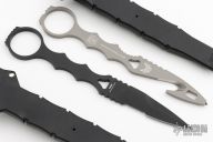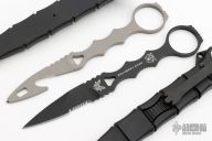 This 176 SOCP Dagger by Benchmade features a black double edged 440C blade and handle with jimping and a ring at the butt. Comes with an injection molded sheath with clip and a matching rescue tool with sheath. Excellent condition.
