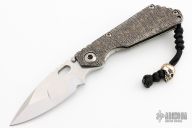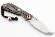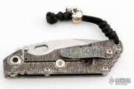 This SNG framelock folder by Mick Strider features a stone washed/satin finish blade with nightmare grind, notched thumbrest and thumbhole. The handle features a magma textured and anodized titanium frame and tip up titanium clip. Includes a "Lock Bar Stabilizer" for maximum reverse lock retention. Nice detent, lockup and blade seating. Comes with a zippered case. Excellent condition. Adorned with a 99% silver skull bead.