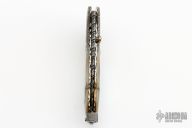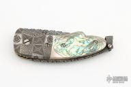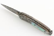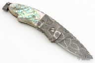 This linerlock by "OLSON" (please let us know if you know which olson this is) features a Damascus blade with fileworked spine, single thumbstud with smokey topaz inlay. The handle has dovetailed mosaic Damascus bolsters, abalone scales, fileworked stainless steel liners, fileworked Damascus backspacer and lanyard bail. Nice detent, lockup and blade seating. Comes with a leather pouch. Excellent condition. Comes with original sales receipt dated February 22 2002