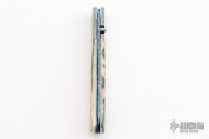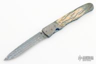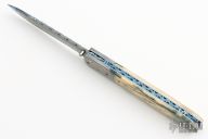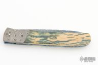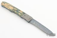 This linerlock by Bill Coffey features a blued Robert Eggerling Damascus blade with a fileworked spine and single thumbstud with diamond set in a gold bezel. The handle has dovetailed Damascus dovetailed bolsters, blue/green mammoth ivory scales, anodized titanium liners, fileworked and blued Damascus backspacer. There are 4 diamonds set into the inside of the backspacer. Comes with a zippered case and original sales receipt dated 4-23-2006. Excellent condition.