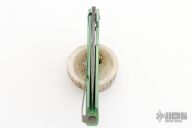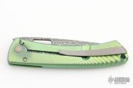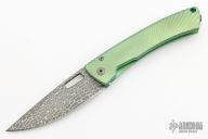 This integral frame-lock folder by Lion Steel features a Damascus spear point blade with square thumb-hole and notched thumb-rest. The handle has an anodized and milled integral titanium frame with tip up stainless steel clip. Has a very strong detent, perfect blade seating and lockup. Excellent condition. Comes with original box and papers.