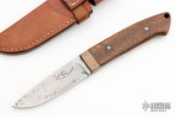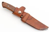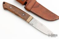 This Lawndale California drop point hunter by Bob Loveless features a satin finished blade with .178" blade stock and .987" blade depth, full tapered tang construction. The handle has brass bolsters with steel pins, walnut wood scales with steel pins and a lanyard hole. Comes with a zippered case and a brown leather sheath that is not original, but fits nicely. It has scuffs, scratches, has been used and carried, has a crack in the blade right at the plunge line, there is a grind mark right at the top of the makers mark, it has pitting, patina, oxidation, has been resharpened and potentially ground and profiled some. The handle is not original, the guard and scales were removed and bolsters and walnut were added. Poor condition.