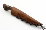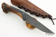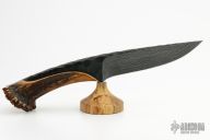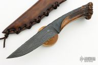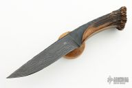 This Damask Barlangor by Attila Kertesz has a Damascus blade with textured spine, full tapered tang construction, .440" blade stock and 1.469" depth at the plunge line. The handle has crown stag scales with hidden pins. Comes with a brown leather sheath. Barlangor translates to "The Protector of the Cave". Comes with a magnetic wooden stand for the knife. Comes with a COA dated 4-10-23. Excellent condition.