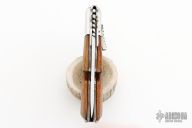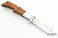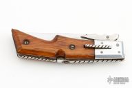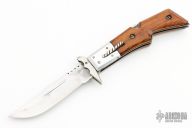 This Russian Handmade Custom Swing Guard Auto features a polished blade with fullers and fileworked thumbrest, steel swing guard. The handle has aluminum bolsters with steel pins, wood scales, steel liners and fileworked backspacer. Has some scuffs and scratches, has some patina, otherwise good condition. Nice strong spring.