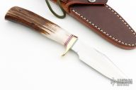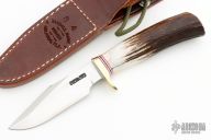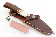 This Model 8-4 by Randall Made Knives features a satin finished blade with sharpened top edge, .159" blade thickness, 1.053" blade depth, hidden tang construction. Especially suitable for small fish and feathered game. Brass guard and stag grip with red/white/blue spacers. Comes with a brown leather sheath and original paper wrapping. New from maker.