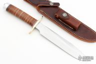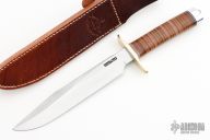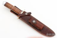 "The Model 1 by Randall Made Knives was made famous by Allied combat troops in World War II and has since been widely used in all theaters of war." This knife features a satin finished blade with a sharpened top edge, .215" blade stock and 1.290" blade depth, hidden tang construction. Brass guard, stacked leather handle with red/white/blue spacers, and a duralumin butt cap. Includes a brown leather sheath and original paper wrapping. New from maker.