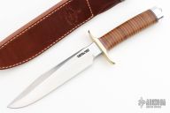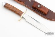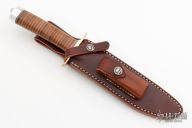 "The Model 1 by Randall Made Knives was made famous by Allied combat troops in World War II and has since been widely used in all theaters of war." This knife features a satin finished blade with a sharpened top edge, .215" blade stock and 1.234" blade depth, hidden tang construction. Brass guard, stacked leather handle with red/white/blue spacers, and a duralumin butt cap. Includes a brown leather sheath and original paper wrapping. New from maker.