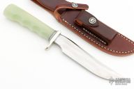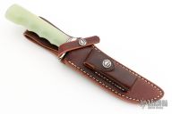 This model 3-6 from Randall Made Knives has an upswept satin finished blade with false top edge, .211" blade stock and 1.157" blade depth, hidden tang construction. The handle has a nickel silver guard, finger groove jade G-10 grip, black/duralumin spacers. Includes brown leather sheath with stone and original paper wrapping. New from maker.