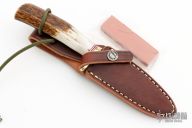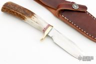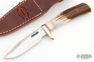 This Model 5-4 by Randall Made Knives features a clip point satin finished blade with false top edge and a notched thumbrest, .150" blade stock, .950" blade depth, hidden tang construction. The handle has a brass guard and stag grip with red/white/blue spacers. Includes a brown leather sheath. New from maker. Comes with original paper wrapping.