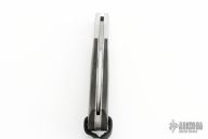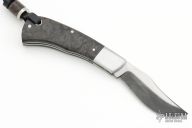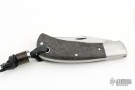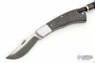 This slipjoint by Jeff Pearce features a two-tone finished blade. The handle has stainless steel bolsters, marble carbon fiber covers, satin stainless steel spring. Has half-stop, flush in all positions. Has some light scratches, otherwise excellent condition. Comes with custom bead attached.