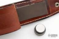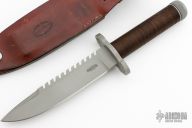 This survival knife by Timberline features a bead blasted spear point blade with sharpened top edge and 10 saw-teeth on blade spine, .249" blade stock and 1.282" blade depth, hidden tang construction. The handle has a bead blasted titanium double guard, hollow cord wrapped handle, and stainless steel removable butt cap with an O-ring to make it water-proof. Comes with brown leather sheath that has a leather flap with a snap covering a honing stone that is embedded in the sheath. The cord that is around the handle is also one piece of cord that can be removed for survival use. The removable butt cap has a polished flat inside that can be used for signaling. The blade is marked "074SE". This knife was well-thought-out and provides everything possible for survival. Has some scuffs/scratches, otherwise good condition.