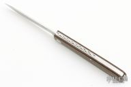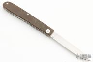 This OLF SS FK by Ohta Knives features a satin finished blade with nail nick. The handle has micarta covers, stainless steel liners, and a fileworked stainless steel spring. Has some light scratches, otherwise excellent condition.