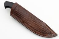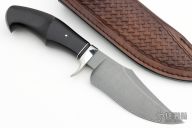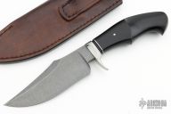 This Hunter by Milan Mozolic features an acid stonewash finished blade with false top edge, .232" blade stock and 1.761" blade depth, hidden tang construction. The handle has a stainless steel guard with black G-10 and bronze spacer, beautiful Arizona Ironwood burl grip with a single polished and domed stainless steel pin. Comes with a black leather sheath. Comes with COA. New from maker! Comes with cloth pouch.
